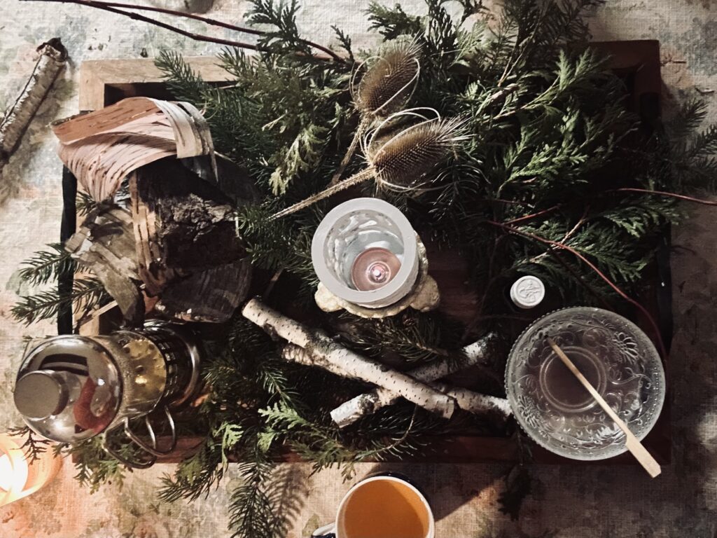 After lighting my candles, and dropping in hints of sage to my water bowl, I sat with the altar pictured below…which I prepared. I reflected on how powerful each of the elements presented were. Fire, Water, Earth, Air, Ether. Each of the natures gifts, before me holding the capacity to grow from a seemingly nothingness- into life. The uncertainty of their darkness not even questioned. They surrender to it, not out of trust.. but out of necessity. Winter does not force things to die because it trusts spring will come.. It asks things to die because what it held in bloom- or rot- this past year will not serve it’s growth when the light grows strong, and springtime comes. Old growth is always forced out by new growth.